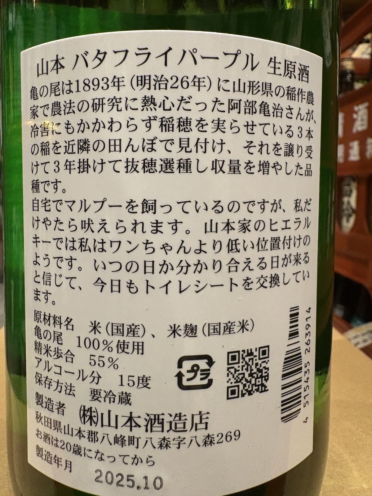 山本 純米吟醸 Butterfly Purple 亀の尾 生原酒 R7BY(要冷蔵) 1.8L
