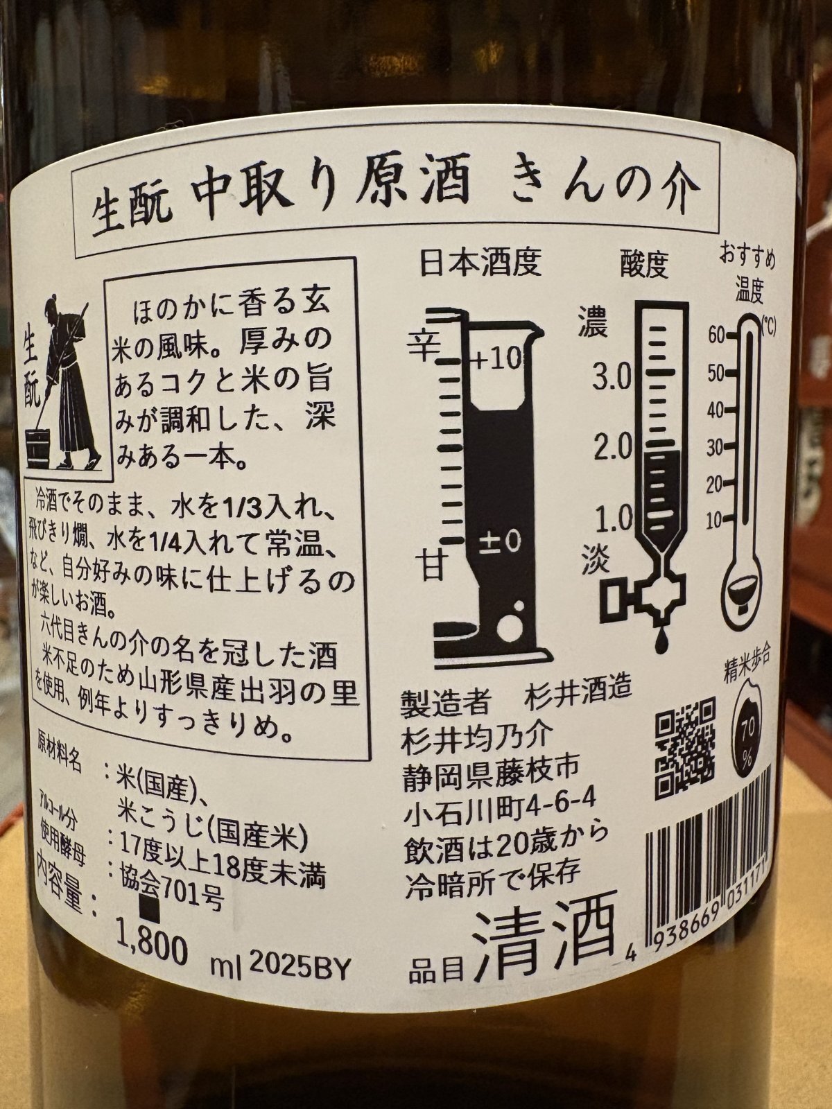 杉錦 生酛純米中取り原酒 きんの介 2025BY 1.8L