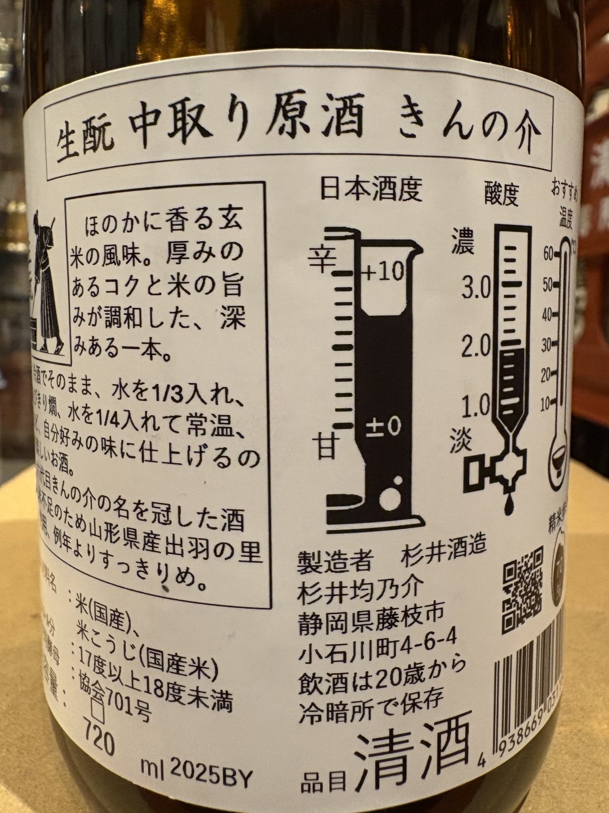 杉錦 生酛純米中取り原酒 きんの介 2025BY 720ml