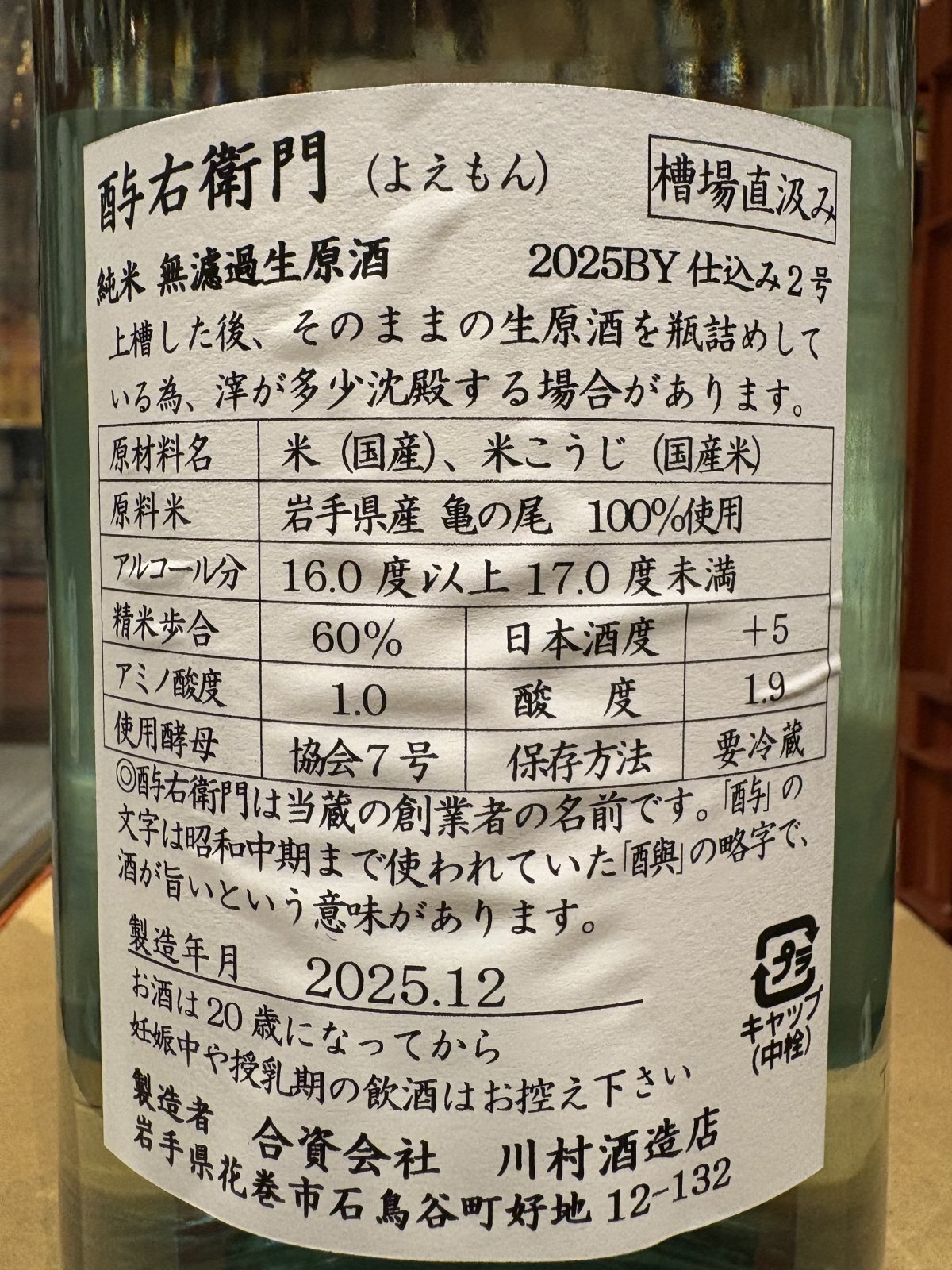 酉与右衛門 純米 亀の尾60 直汲み生原酒 R7BY(要冷蔵) 1.8L