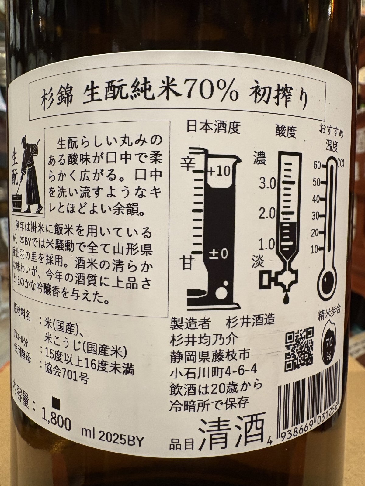 杉錦 生酛純米 初搾り 2025BY 1.8L